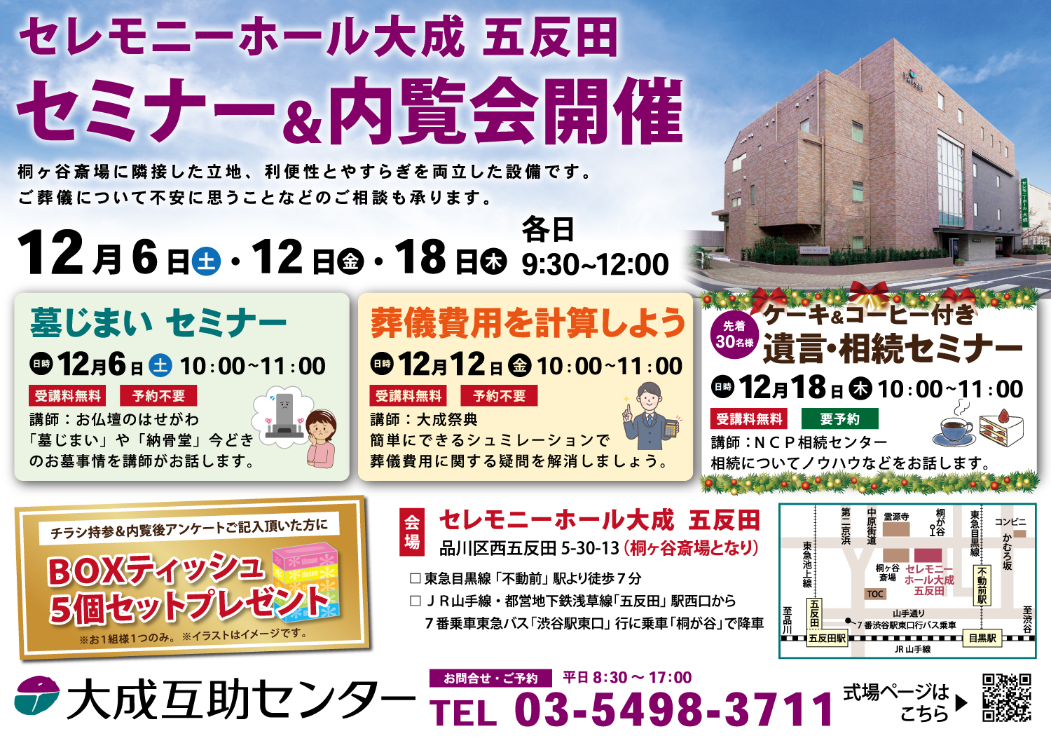 セレモニーホール大成 五反田にてセミナー&内覧会を開催します。