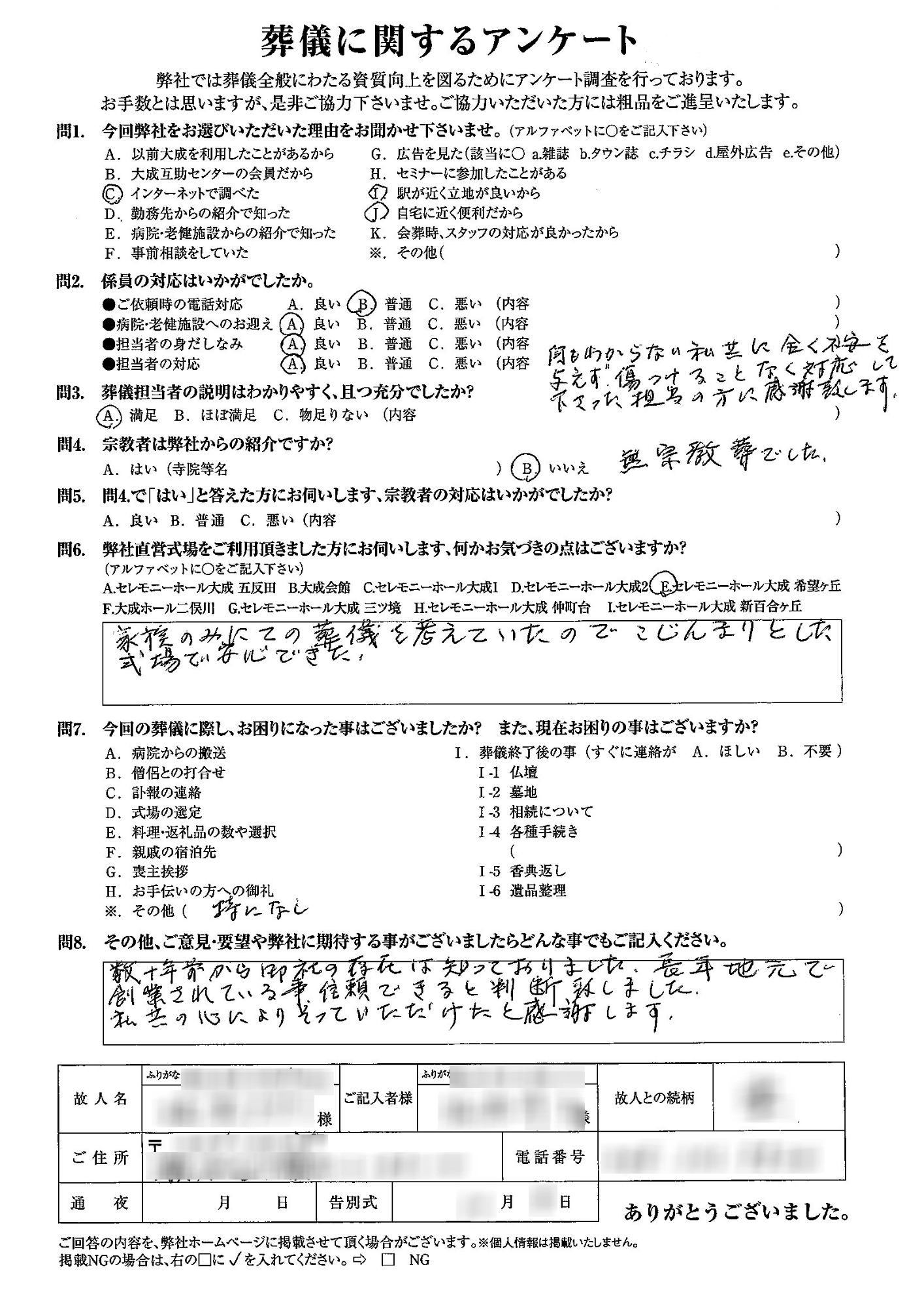 家族のみにての葬儀を考えていたのでこじんまりとした式場で安心できた。数十年前から御社の存在は知っておりました。長年地元で創業されている事、信頼できると判断致しました。私共の心によりそっていただけたと感謝します。