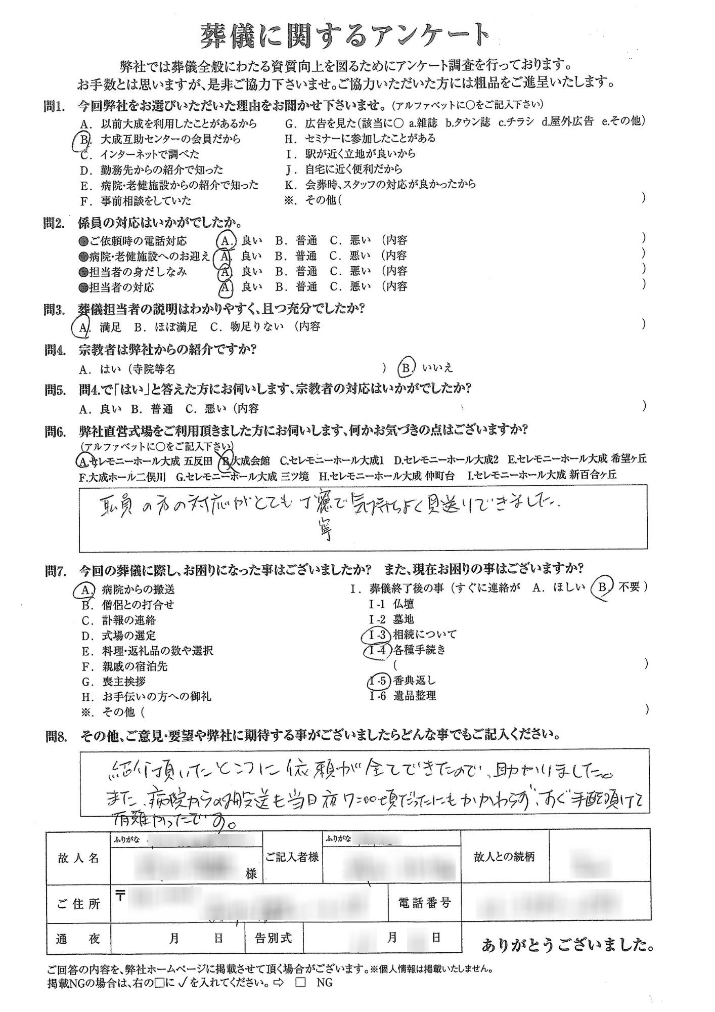 職員の方の対応がとても丁寧で気持ちよく見送りできました。紹介頂いたところに依頼が全てできたので、助かりました。また、病院からの搬送も当日夜7:00頃だったにもかかわらずすぐ手配頂けて有難かったです。