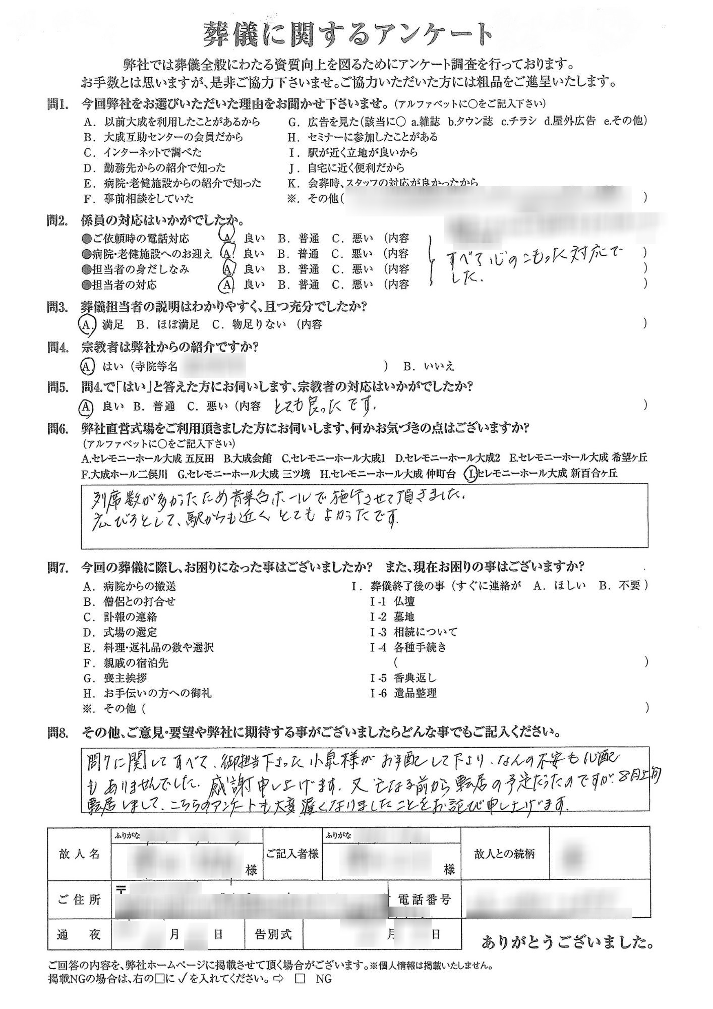 すべて心のこもった対応でした。列席数が多かったため青葉台ホールで施工させて頂きました。広びろとして、駅からも近くとてもよかったです。問7に関してすべて御担当下さった小泉様がお手配して下さり、なんの不安も心配もありませんでした。感謝申し上げます。又、亡くなる前から転居の予定だったのですが、8月上旬に転居しまして、こちらのアンケートも大変遅くなりましたことをお詫び申し上げます。